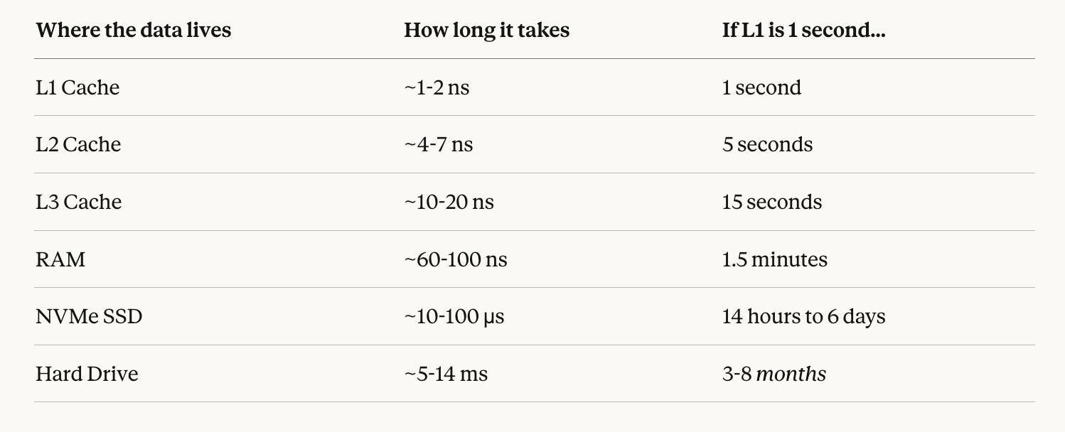 I looked up the actual latency numbers for a modern CPU because apparently this is what I do instead of addressing my jet lag and the hierarchy is staggering: